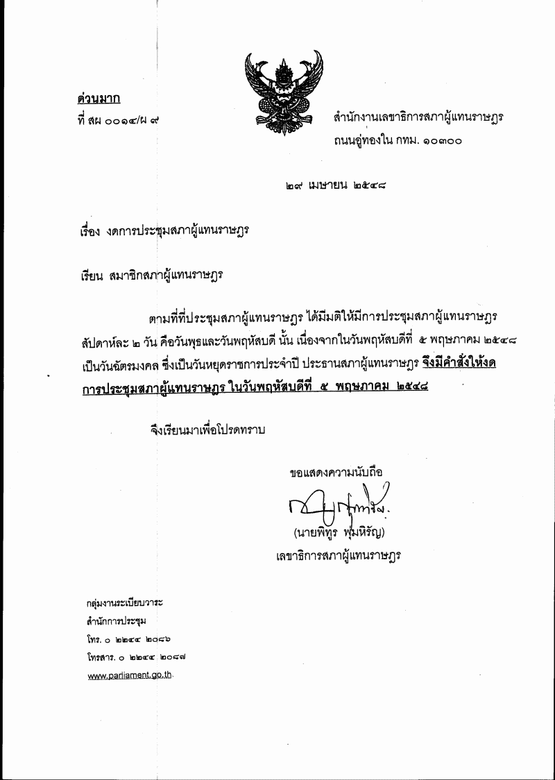 ชื่อเอกสาร : งดการประชุมสภาผู้แทนราษฎร ในวันพฤหัสบดีที่ 5 พฤษภาคม 2548