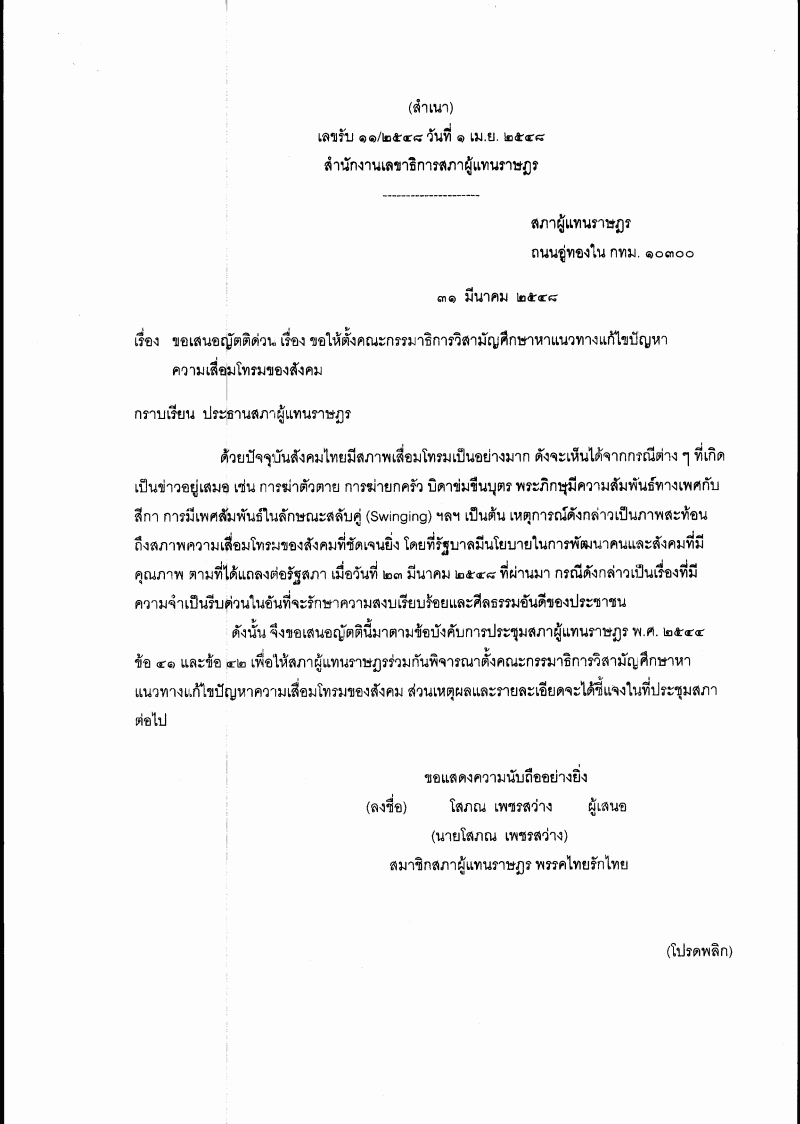 ญัตติด่วน เรื่อง ขอให้ตั้งคณะกรรมาธิการวิสามัญศึกษาหาแนวทางแก้ไขปัญหาความเสื่อมโทรมของสังคม (นายโภณ เพชรสว่าง เป็นผู้เสนอ) |