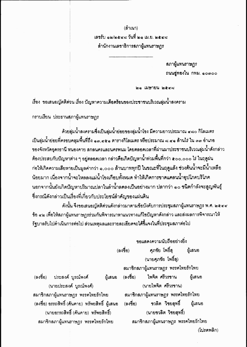 ญัตติด่วน เรื่อง ปัญหาความเดือดร้อนของประชาชนบริเวณลุ่มน้ำสงคราม (นายศุภชัย โพธิสุ กับคณะ เป็นผู้เสนอ) |
