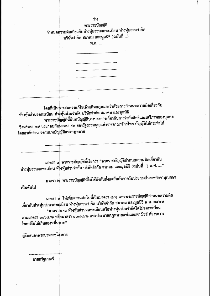 ชื่อเอกสาร :   ร่างพระราชบัญญัติแก้ไขเพิ่มเติมประมวลกฎหมายแพ่งและพาณิชย์ (แบับที่ ..) พ.ศ. .... (กำหนดหลักการจดทะเบียนห้างหุ้นส่วนสามัญ) และร่างพระราชบัญญัติกำหนดความผิดเกี่ยวกับห้างหุ้นส่วนจดทะเบียน ห้างหุ้นส่วนจำกัด บริษัทจำกัด สมาคม และมูลนิธิ (ฉบับที่ ..) พ.ศ. .... (กำหนดโทษปรับของห้างหุ้นส่วนจำกัดที่ไม่ดำเนินการจดทะเบียนการเปลี่ยนแปลงหุ้นส่วนผู้จัดการ)
