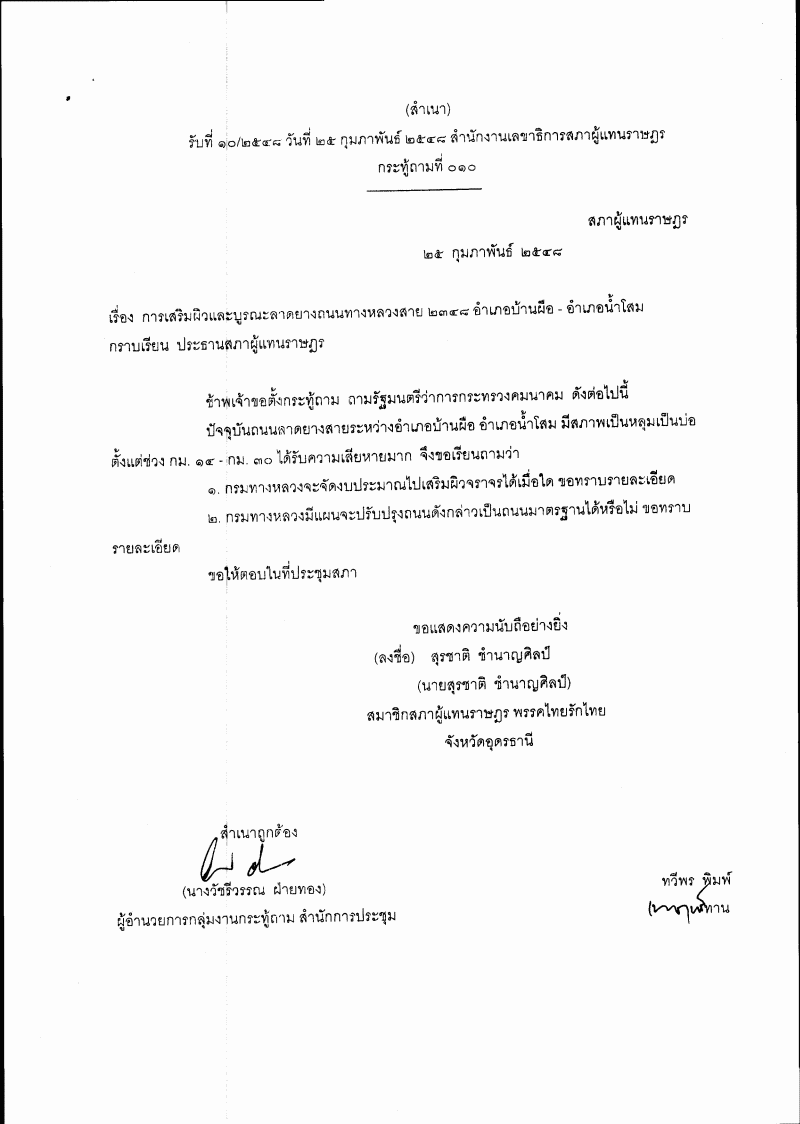 ชื่อเอกสาร :   กระทู้ถาม เรื่องการเสริมผิวและบูรณะลาดยางถนนทางหลวงสาย 2348 อำเภอบ้านผือ - อำเภอน้ำโสม