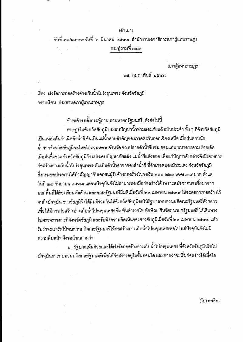 • กระทู้ถาม เรื่อง เร่งรัดการก่อสร้างอ่างเก็บน้ำโปร่งขุนเพชร จังหวัดชัยภูมิ