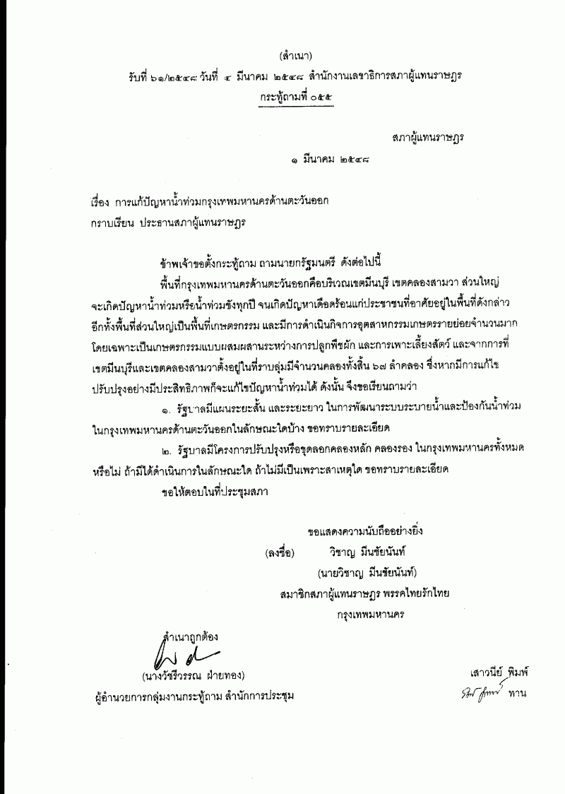 ชื่อเอกสาร : กระทู้ถาม เรื่อง การแก้ปัญหาน้ำท่วมกรุงเทพมหานครด้านตะวันออก