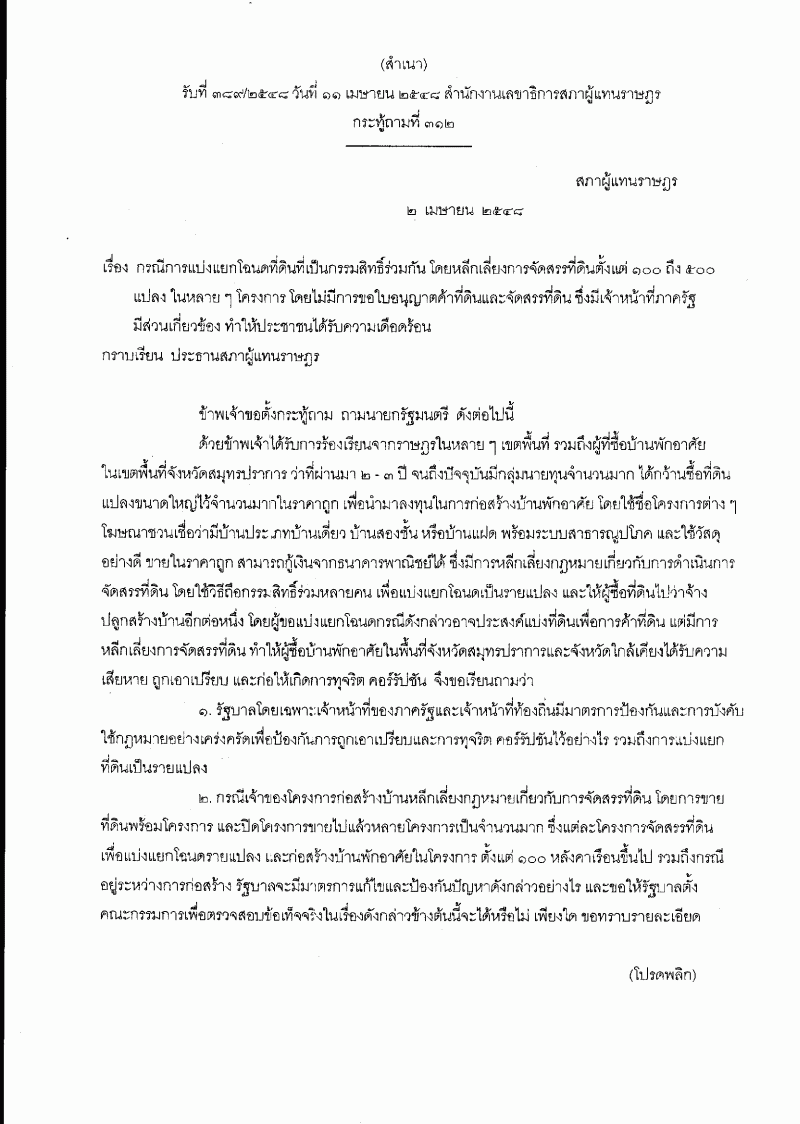 ชื่อเอกสาร :   กระทู้ถาม เรื่อง กรณีการแบ่งแยกโฉนดที่ดินทีเป็นกรรมสิทธิ์ร่วมกัน
