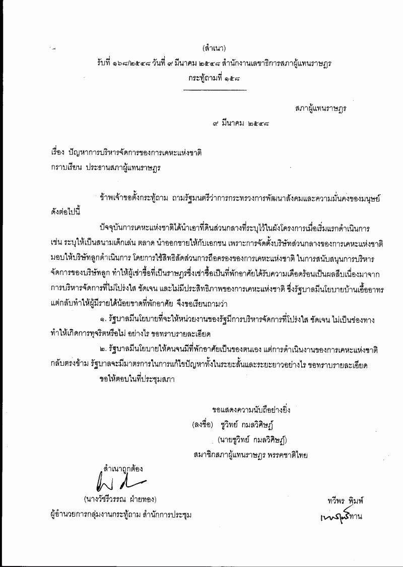 ชื่อเอกสาร : กระทู้ถาม เรื่อง ปัญหาการบริหารจัดการของการเคหะแห่งชาติ