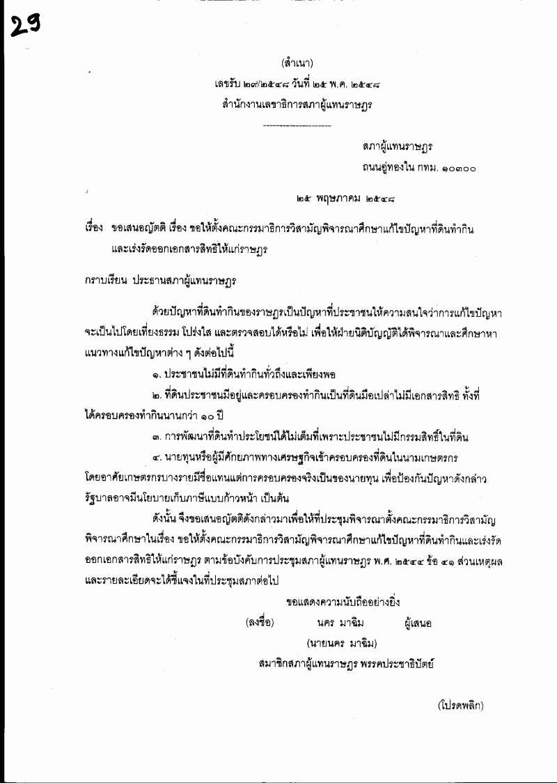 ชื่อเอกสาร :   ญัตติด่วน เรื่อง ขอให้ตั้งคณะกรรมาธิการวิสามัญพิจารณาศึกษาแก้ไขปัญหาที่ดินทำกินและเร่งรัดออกเอกสารสิทธิให้แก่ราษฎร