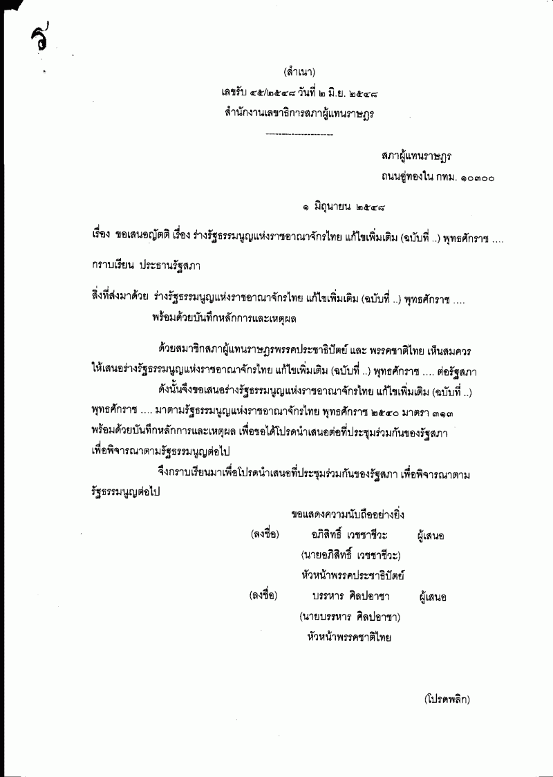 • ร่างรัฐธรรมนูญแห่งราชอาณาจักรไทย แก้ไขเพิ่มเติม (ฉบับที่..) พุทธศักราช .... (แก้ไขเพิ่มเติม มาตรา 138 (1) (2) (4) มาตรา 257 (1) และ มาตรา 297 วรรคสาม)