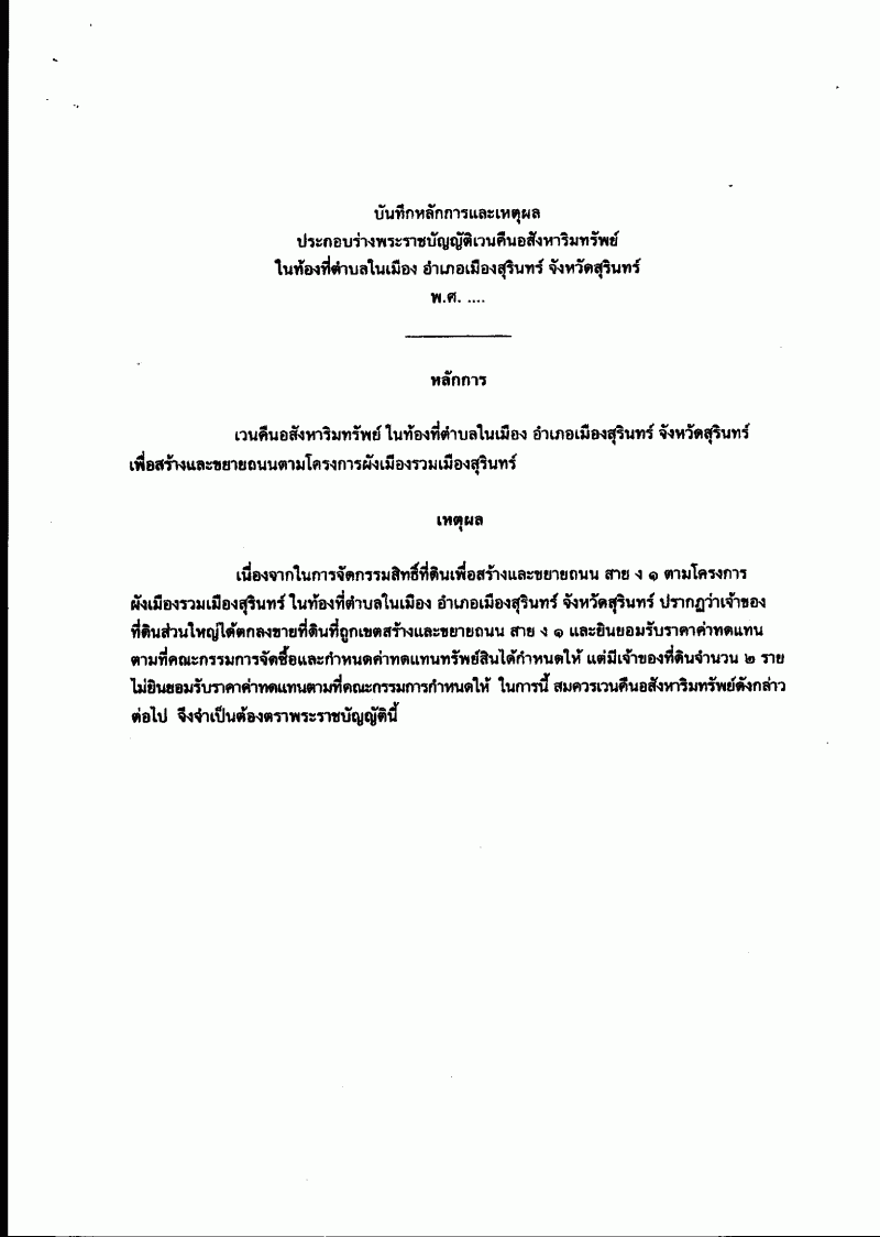 ชื่อเอกสาร :   ร่างพระราชบัญญัติเวนคืนอสังหาริมทรัพย์ ในท้องที่ตำบลในเมือง อำเภอเมืองสุรินทร์ จังหวัดสุรินทร์