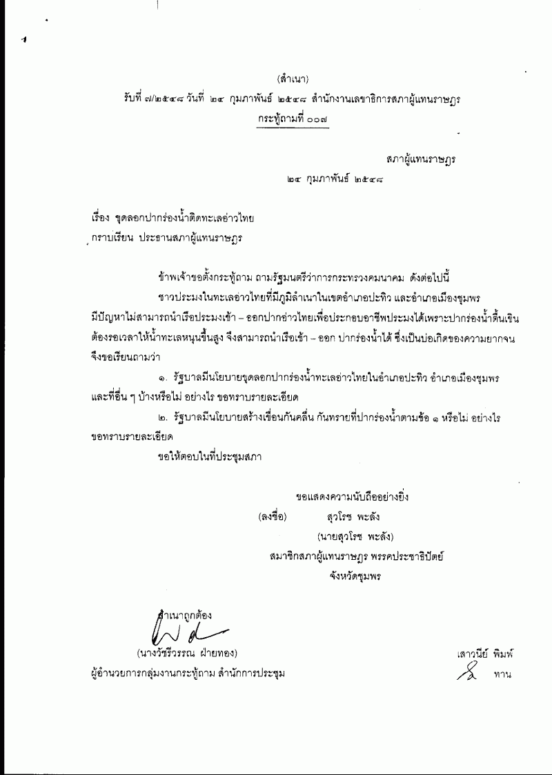 ชื่อเอกสาร : กระทู้ถาม เรื่อง ขุดลอกปากร่องน้ำติดทะเลอ่าวไทย