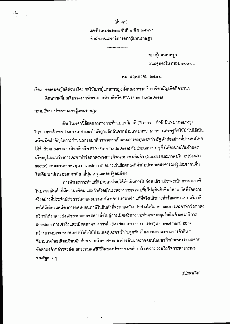 ญัตติ เรื่อง ขอให้สภาผู้แทนราษฎรตั้งคณะกรรมาธิการวิสามัญเพื่อพิจารณาศึกษาผลดีผลเสียของการทำเขตการค้าเสรี |