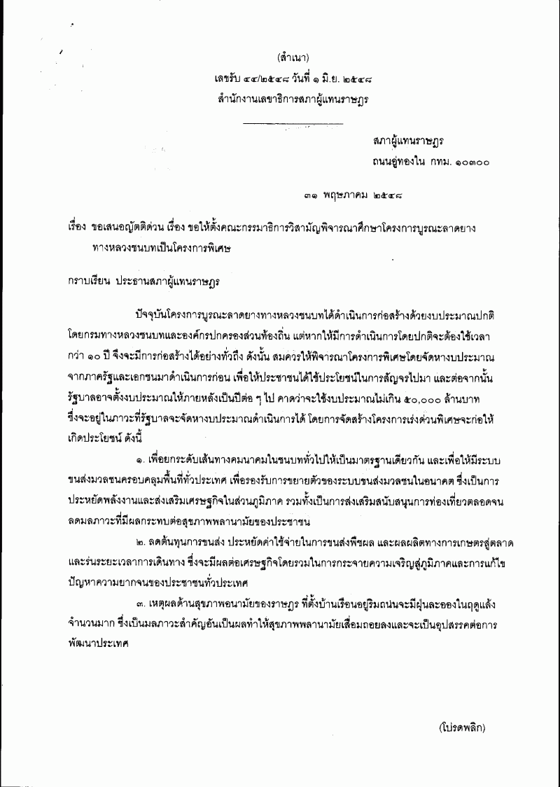 ชื่อเอกสาร :   ญัตติ เรื่อง ขอให้ตั้งคณะกรรมาธิการวิสามัญพิจารณาศึกษาโครงการบูรณะลาดยาง