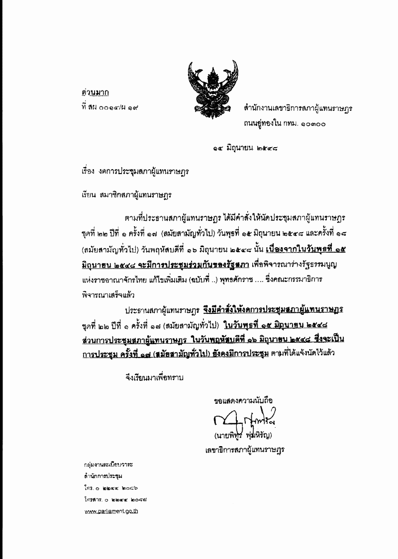 ชื่อเอกสาร : งดการประชุมสภาผู้แทนราษฎร ในวันพุธที่ 15 มิถุนายน 2548