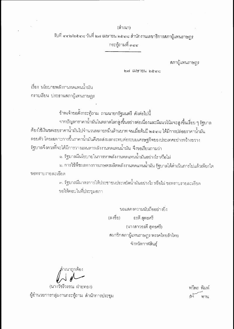 ชื่อเอกสาร : กระทู้ถาม เรื่อง นโยบายพลังงานทดแทนน้ำมัน