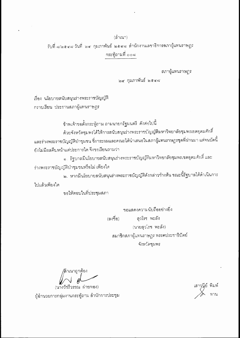 ชื่อเอกสาร : กระทู้ถาม เรื่อง นโยบายสนับสนุนร่างพระราชบัญญัติ