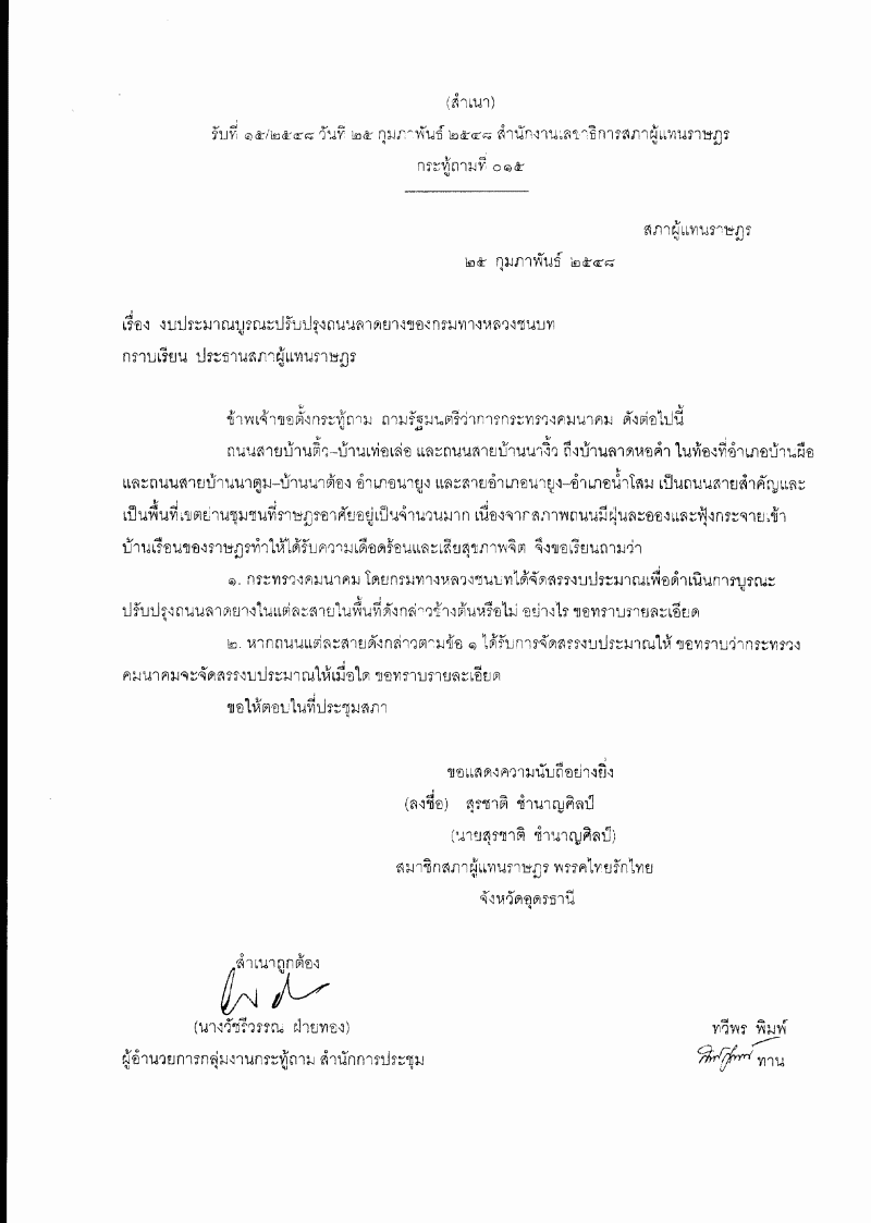 ชื่อเอกสาร : กระทู้ถาม เรื่อง งบประมาณบูรณะปรับปรุงถนนลาดยางของกรมทางหลวงชนบท