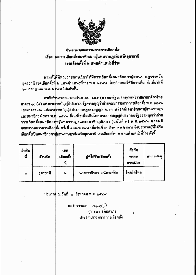 ชื่อเอกสาร : รับทราบเรื่อง ประกาศผลการเลือกตั้งสมาชิกสภาผู้แทนราษฎร