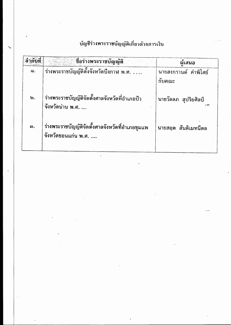 • ร่างพระราชบัญญัติตั้งจังหวัดบึงกาฬ พ.ศ. ...., ร่างพระราชบัญญัติจัดตั้งศาลจังหวัดที่อำเภอปัว จังหวัดน่าน พ.ศ. ...., ร่างพระราชบัญญัติจัดตั้งศาลจังหวัดที่อำเภอชุมแพ จังหวัดขอนแก่น พ.ศ. ....