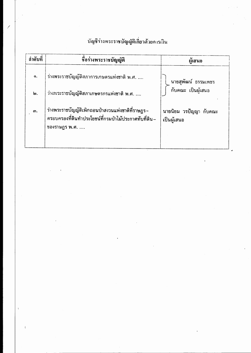• ร่างพระราชบัญญัติสภาการเกษตรแห่งชาติ พ.ศ. ...., ร่างพระราชบัญญัติสภาเกษตรกรแห่งชาติ พ.ศ. ...., ร่างพระราชบัญญัติเพิกถอนป่าสงวนแห่งชาติ