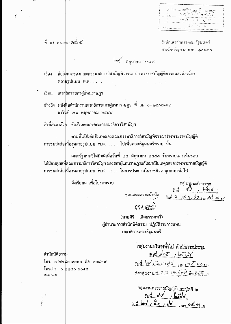 รับทราบผลการดำเนินงานตามข้อสังเกตของคณะกรรมาธิการวิสามัญพิจารณาร่างพระราชบัญญัติการขนส่งต่อเนื่อง |