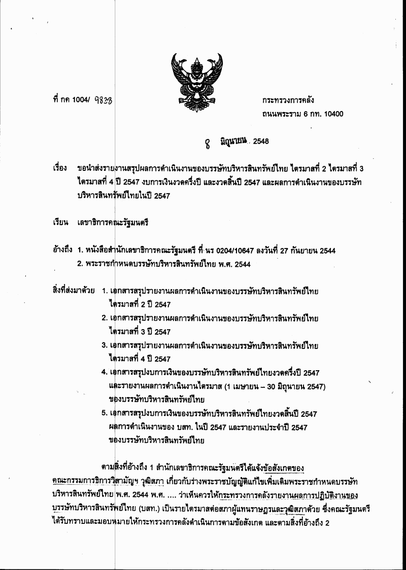 รับทราบรายงานสรุปผลการดำเนินงงานของบรรษัทบริหารสินทรัพย์ไทย ไตรมาสที่ 2 ไตรมาสที่ 3 ไตรมาสที่ 4 ปี 2547 |