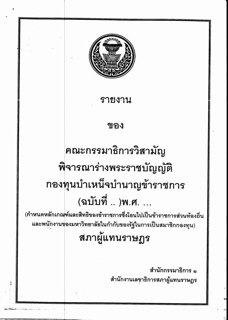 ชื่อเอกสาร :   ร่างพระราชบัญญัติกองทุนบำเหน็จบำนาญข้าราชการ (ฉบับที่ ..) พ.ศ. ....