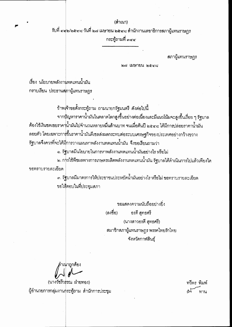 ชื่อเอกสาร : กระทู้ถาม เรื่อง นโยบายพลังงานทดแทนน้ำมัน