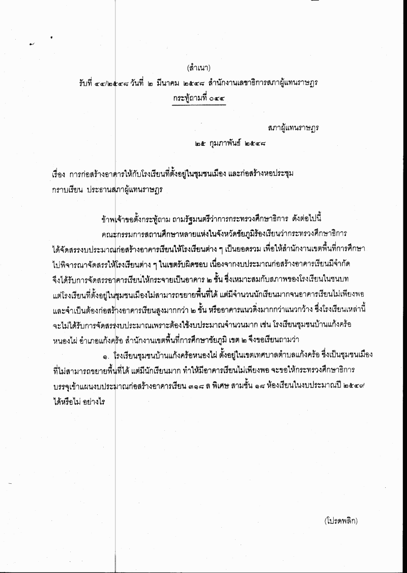 กระทู้ถาม เรื่อง การก่อสร้างอาคารให้กับโรงเรียนที่ตั้งอยู่ในชุมชนเมือง และก่อสร้างหอประชุม |