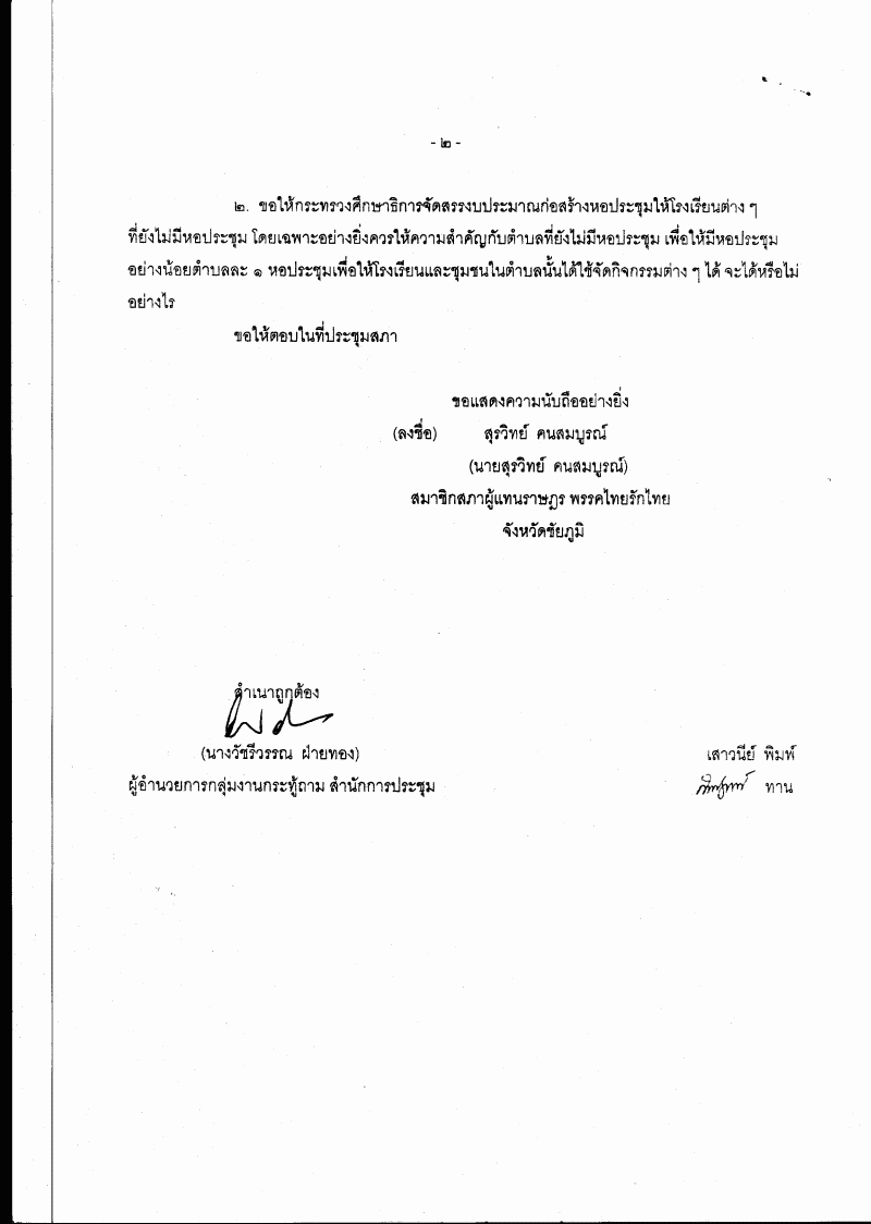 • กระทู้ถาม เรื่อง การก่อสร้างอาคารให้กับโรงเรียนที่ตั้งอยู่ในชุมชนเมือง และก่อสร้างหอประชุม