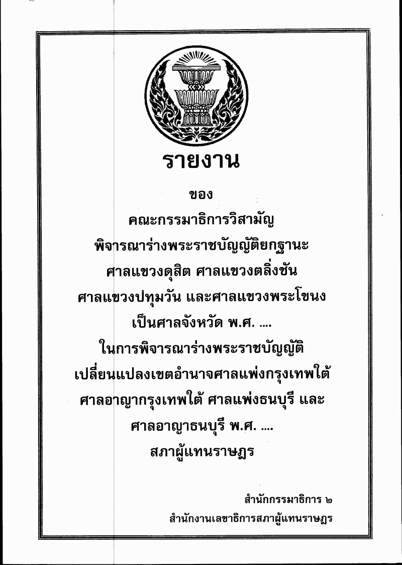 ชื่อเอกสาร :   ร่างพระราชบัญญัติเปลี่ยนแปลงเขตอำนาจศาลแพ่งกรุงเทพใต้ ศาลอาญากรุงเทพใต้ ศาลแพ่งธนบุรี และศาลอาญาธนบุรี พ.ศ. ....