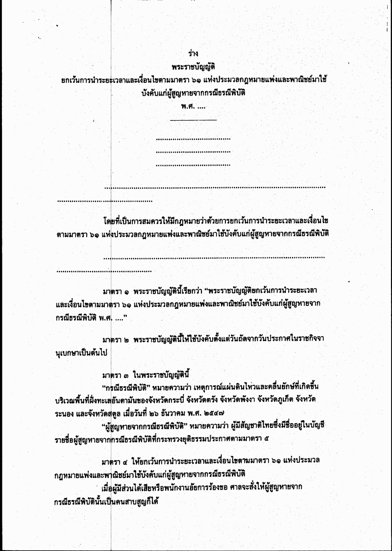 ชื่อเอกสาร :   ร่างพระราชบัญญัติยกเว้นการนำระยะเวลาและเงื่อนไขตามมาตรา ๖๑