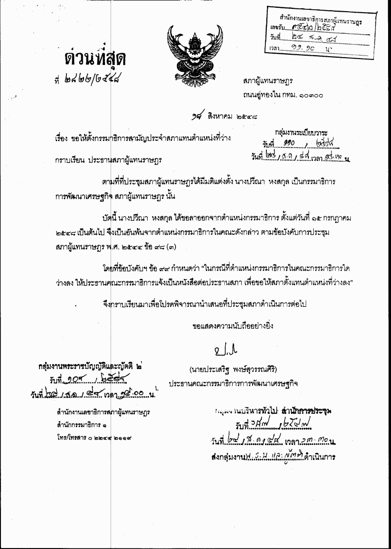 ชื่อเอกสาร : ตั้งซ่อมกรรมาธิการสามัญประจำสภา ในคณะกรรมาธิการการพัฒนาเศรษฐกิจ