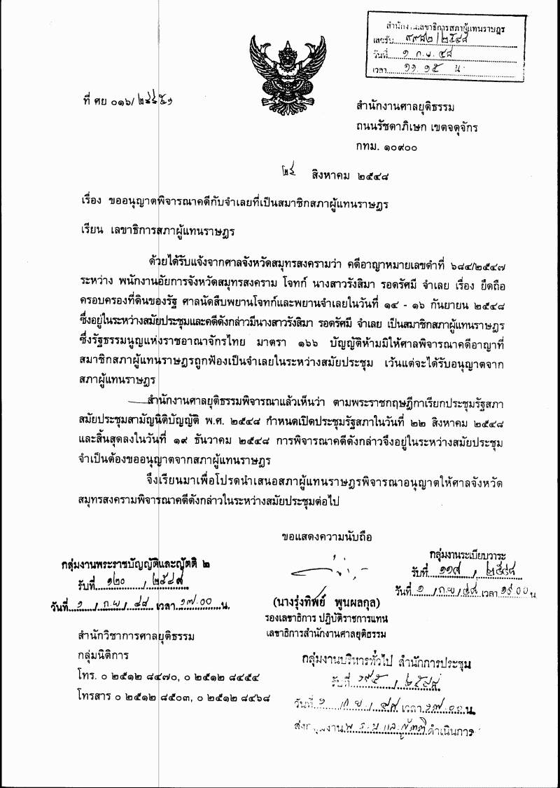 ชื่อเอกสาร : ขออนุญาตพิจารณาคดีกับจำเลยที่เป็นสมาชิกสภาผู้แทนราษฎร