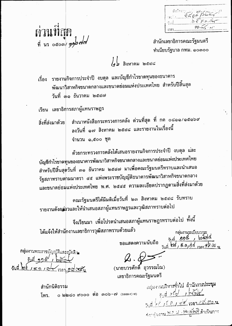 รายงานกิจการประจำปี งบดุล และบัญชีกำไรขาดทุนของธนาคารพัฒนาวิสาหิจขนาดกลางและขนาดย่อมแห่งประเทศไทย |