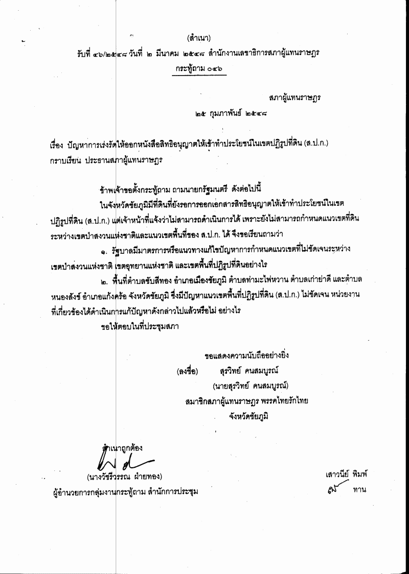กระทู้ถาม เรื่อง ปัญหาการเร่งรัดให้ออกหนังสือสิทธิอนุญาตให้เข้าทำประโยชน์ในเขตปฏิรูปที่ดิน (ส.ป.ก.) |