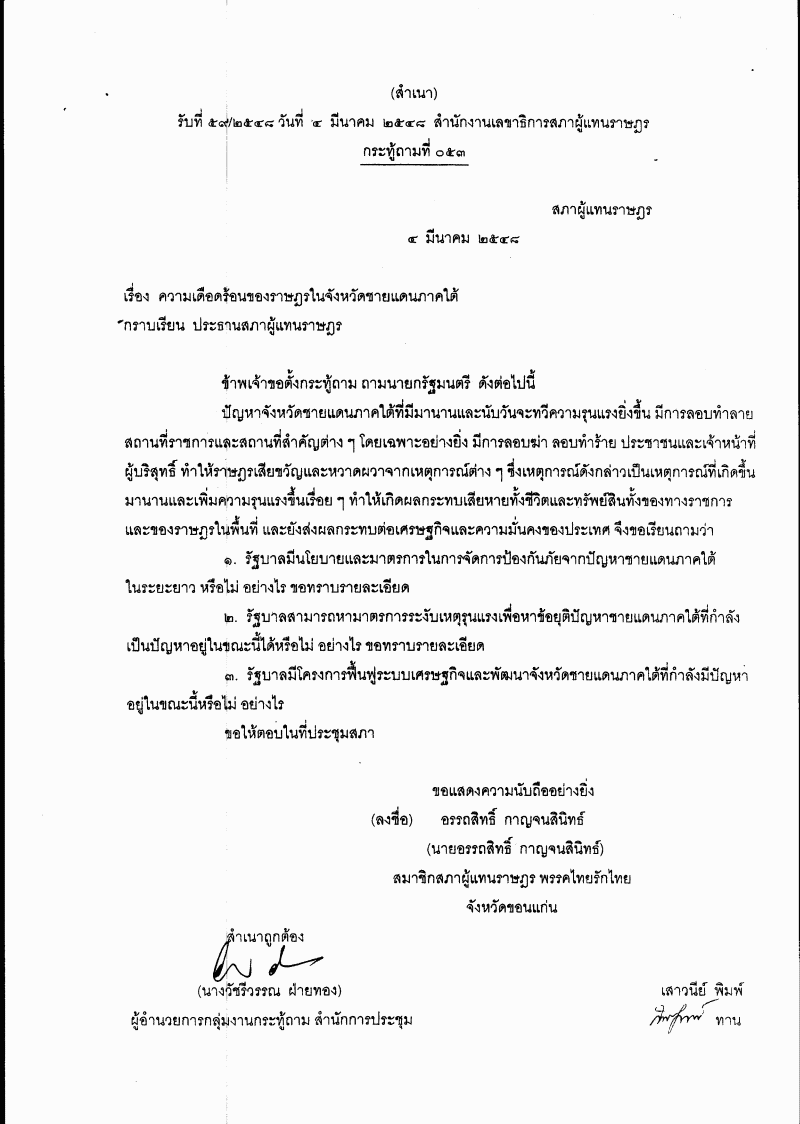 ชื่อเอกสาร : ความเดือดร้อนของราษฎรในจังหวัดชายแดนภาคใต้