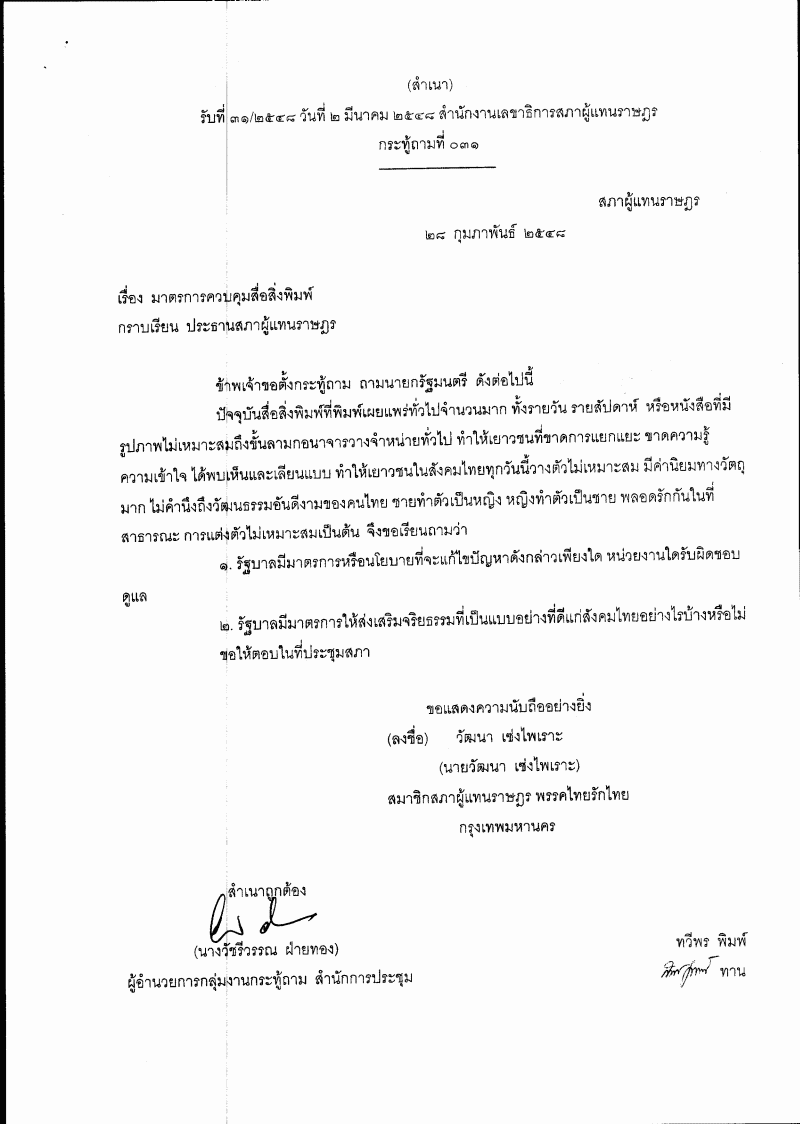 กระทู้ถาม เรื่อง มาตรการควบคุมสื่อสิ่งพิมพ์ |