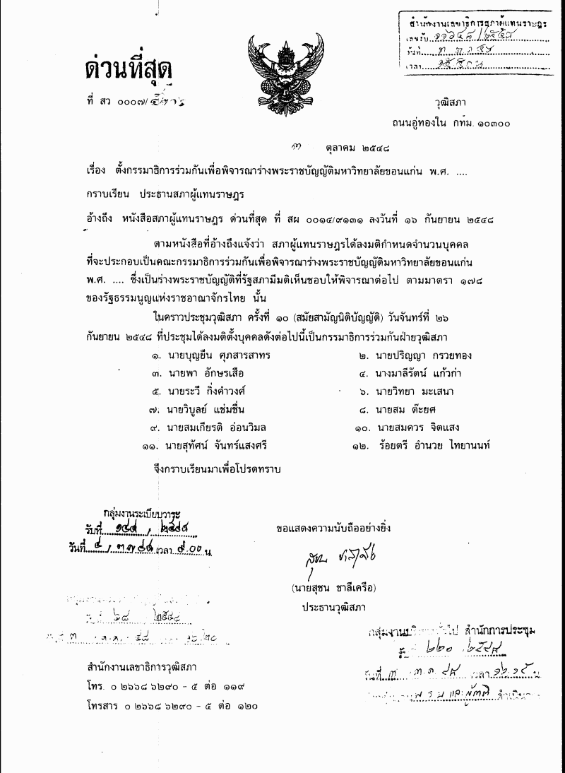 ตั้งกรรมาธิการร่วมกันเพื่อพิจารณาร่างพระราชบัญญัติมหาวิทยาลัยขอนแก่น พ.ศ. .... |