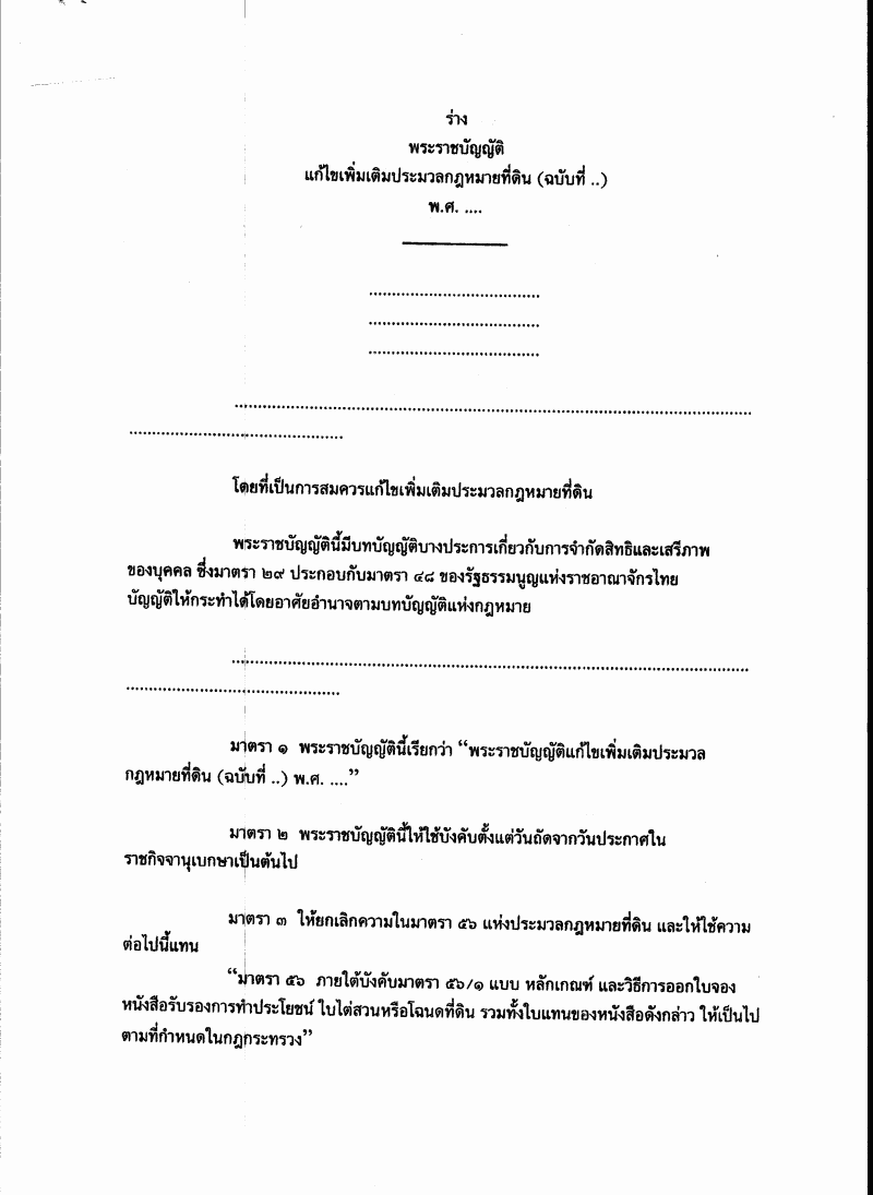 ชื่อเอกสาร :   ร่างพระราชบัญญัติแก้ไขเพิ่มเติมประมวลกฎหมายที่ดิน (ฉบับที่ ..) พ.ศ. ....