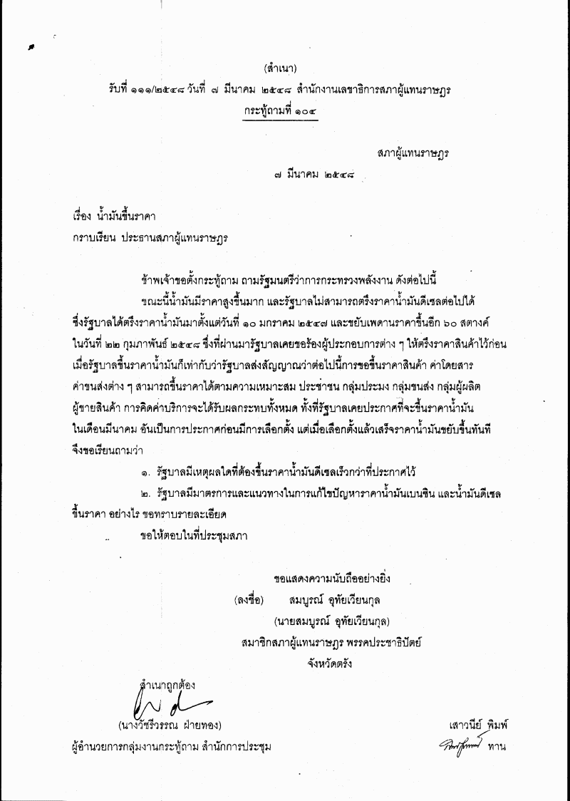 ชื่อเอกสาร : กระทู้ถามที่ ๑๐๔ เรื่อง น้ำมันขึ้นราคา