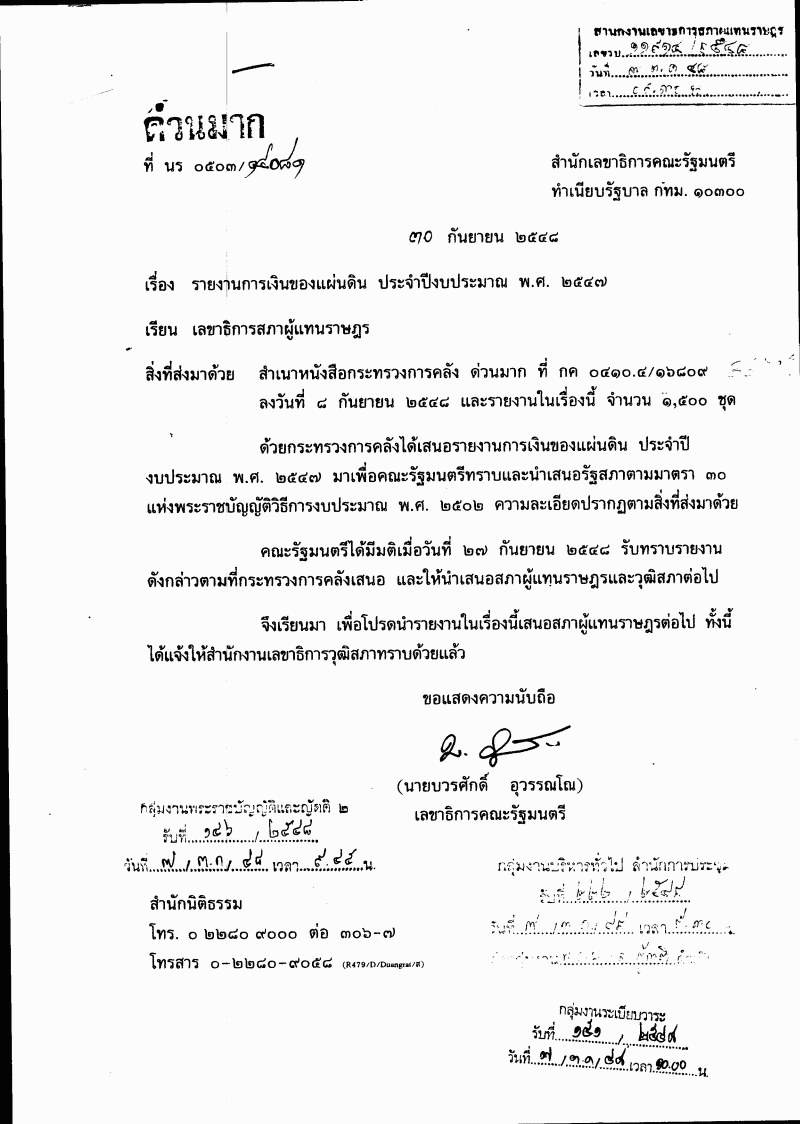 • รับทราบรายงานการเงินของแผ่นดิน ประจำปีงบประมาณ พ.ศ. ๒๕๔๗