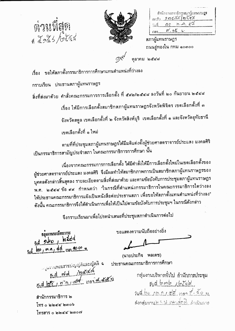 ชื่อเอกสาร : ขอให้สภาต้งกรรมาธิการการศึกษาแทนตำแหน่งที่ว่างลง