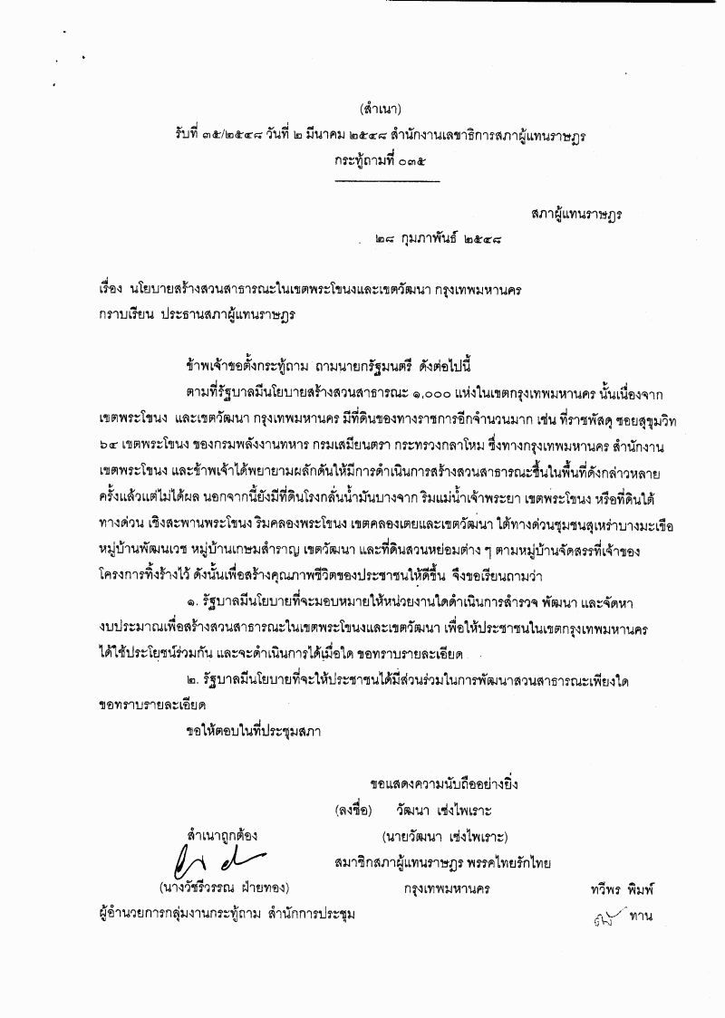 ชื่อเอกสาร : นโยบายสร้างสวนธารณะในเขตพระโขนงและเขตวัฒนา กรุงเทพมหานคร