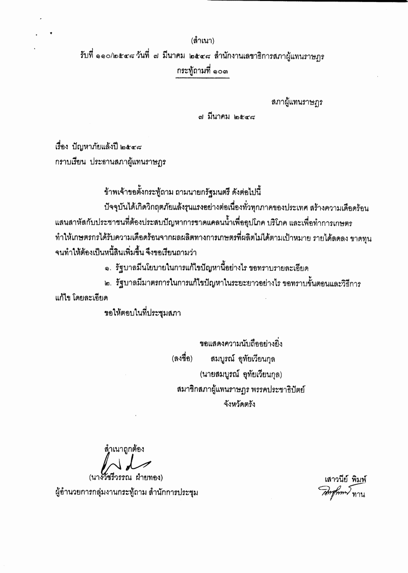 ระเบียบวาระการประชุมสภาผู้แทนราษฎร > ชุดที่ 22 > ปีที่ 1 > สมัยสามัญนิติบัญญัติ > ครั้งที่ 21 > (1) กระทู้ถาม