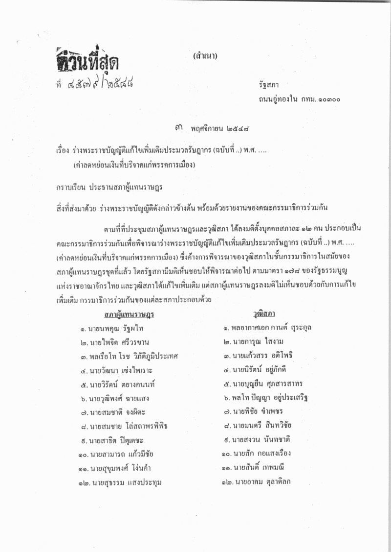 ชื่อเอกสาร :   ร่างพระราชบัญญัติแก้ไขเพ่มเติมประมวลรัษฎากร (ฉบับที่ ..) พ.ศ. .... (ค่าลดหย่อนเงินที่บริจาคแก่พรรคการเมือง)
