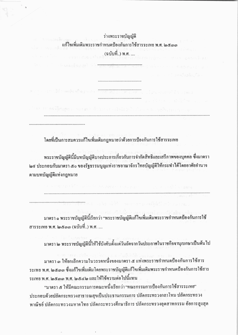 ชื่อเอกสาร :   ร่างพระราชบัญญัติแก้ไขเพิ่มเติมพระราชกำหนดป้องกันการใช้สารระเห พ.ศ. 2533 (ฉบับที่ ..) พ.ศ. .... (นริศ ขำนุรักษ์ และว่าที่ร้อยตรี โมฮามัดยาสรี ยูซง เป็นผู้เสนอ)