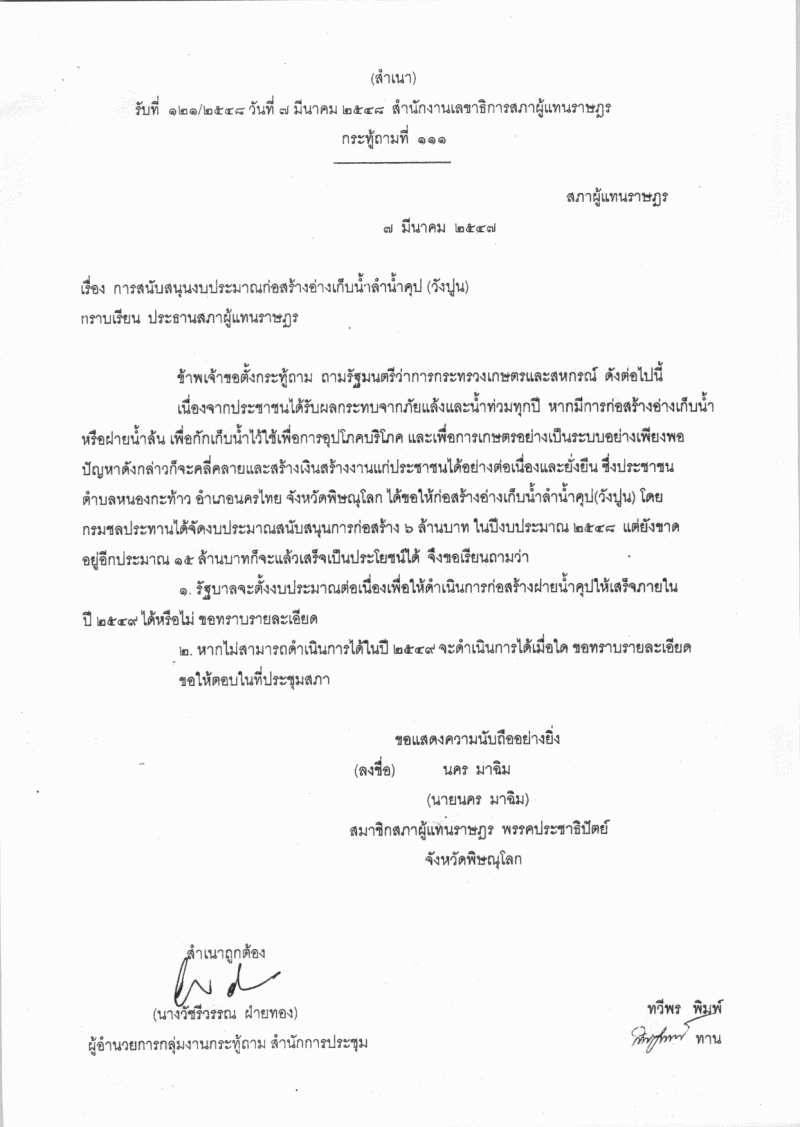 ชื่อเอกสาร : การสนับสนุนงบประมาณก่อสร้างอ่างเก็บน้ำลำน้ำคุป (วังปูน)