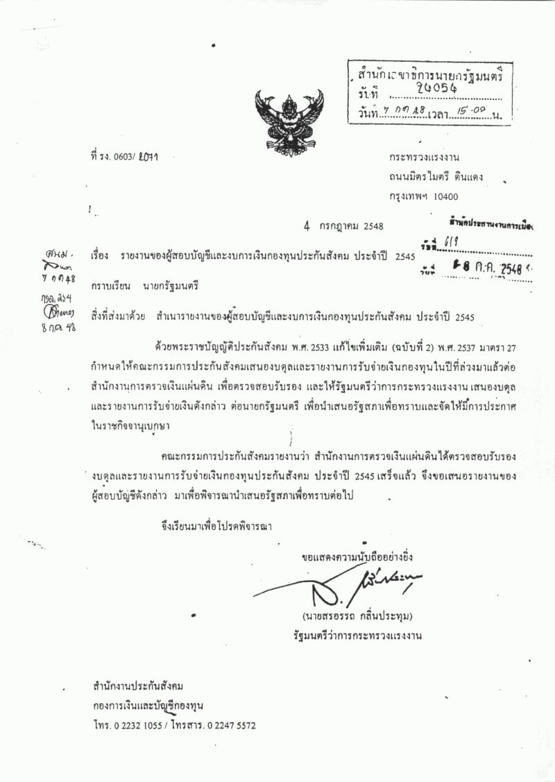 ชื่อเอกสาร :   รับทราบรายงานของผู้สอบบัญชีและงบการเงินกองทุนประกันสังม ประจำปี ๒๕๔๕