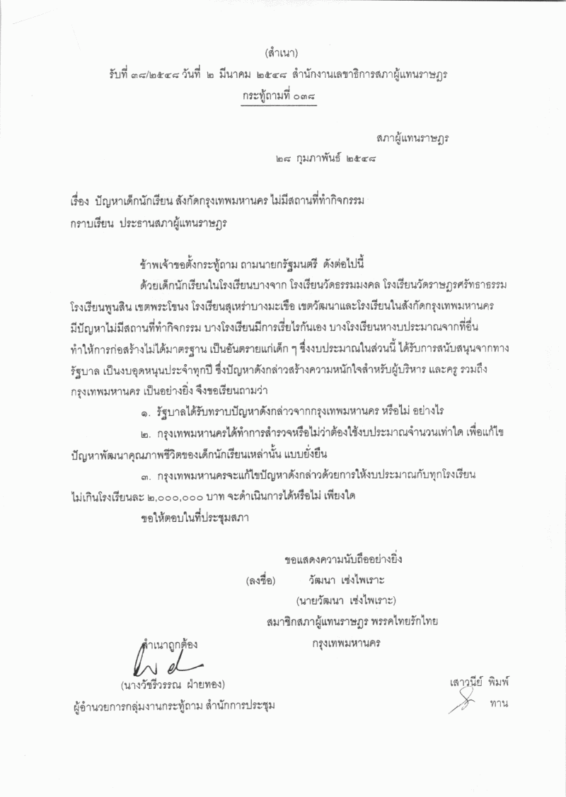 กระทู้ถามที่ ๐๓๘ เรื่อง ปัญหาเด็กนักเรียน สังกัดกรุงเทพมหานคร ไม่มีสถานที่ทำกิจกรรม |