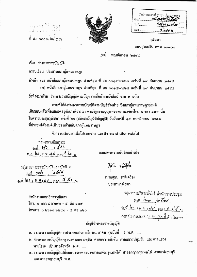ชื่อเอกสาร : รับทราบเรื่องวุฒิสภาได้ลงมติเห็นชอบด้วยกับร่างพระราชบัญญัติ