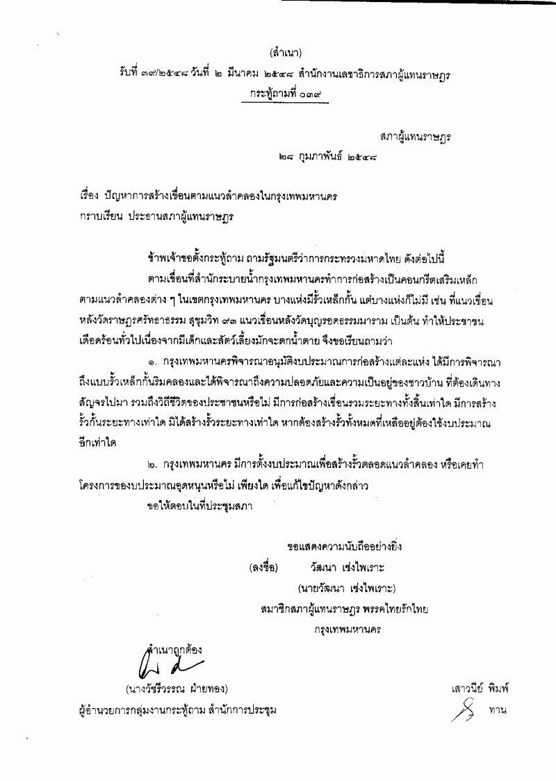 กระทู้ถามที่ ๐๓๙ เรื่อง ปัญหาการสร้างเขื่อนตามแนวลำคลองในกรุงเทพมหานคร |